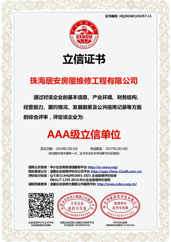 珠海居安房屋維修工程有限公司成立于2020年,是一家專注房屋維修的公司。我們擁有各類型專業(yè)人才,業(yè)務(wù)包括老舊建筑翻新改造、外墻空鼓修復(fù)、防水幕墻養(yǎng)護、外墻預(yù)置構(gòu)件拆除更換、供排水管網(wǎng)改造、墻面翻新、鋼制結(jié)構(gòu)建筑構(gòu)建及折除,外墻清洗及裝修裝飾。 公司自成立以來,始終堅持以人為本、誠信敬業(yè)的經(jīng)營原則,與多家單位達(dá)成固定維修、養(yǎng)護清洗協(xié)儀,業(yè)務(wù)遍及廣州、東莞、中山、珠海等多個周邊城市。專業(yè)化團隊尤其在墻面及窗邊防水工程業(yè)內(nèi)知名。…… >>> 更多內(nèi)容 |